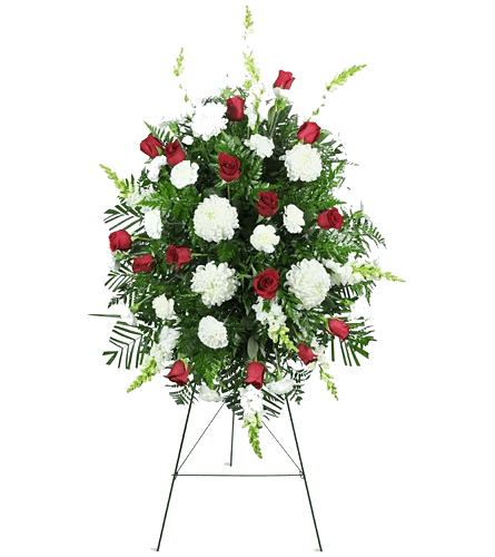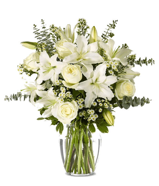 This arrangement is an elegant tribute to a beautiful life. Designed with white lilies, white roses, and fragrant eucalyptus, this arrangement will bring comfort to those who have lost their loved one.
